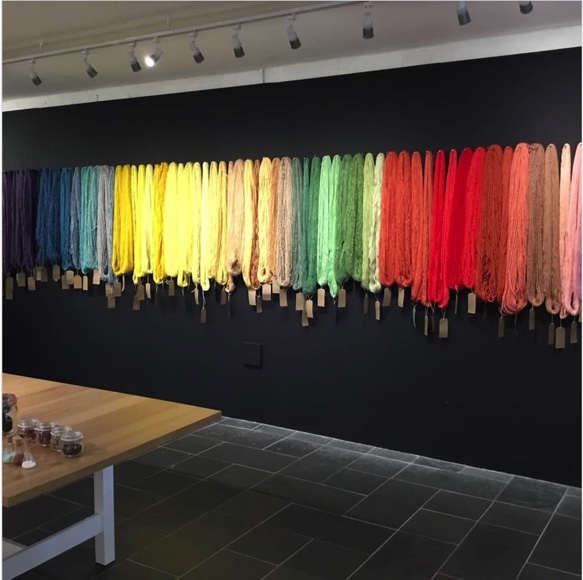 Jane Deane’s stunning exhibition ‘Colour, Naturally‘ for the Devon Guild of Craftsmen is awesome. Have a look at her striking display of eighty-three 100g skeins dyed in natural colours, (simple maths shows that is an staggering amount of dyeing!!).